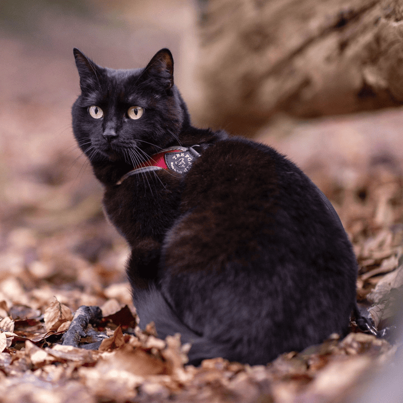 The black cat in the first photo is Lola, and she’s wearing an Easy Fit Adjustable Strap Original harness with reflective trim.