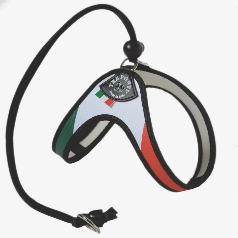Warning: put the harness on your pet and adjust the strap. The size is correct when the Tre Ponti logo is over the shoulder of your pet and doesn't restrict their movements. Check the strap regularly: if it looks worn out, replace it with an original new one. You can find our Tre Ponti straps on our official website or ask your Tre Ponti dealer.