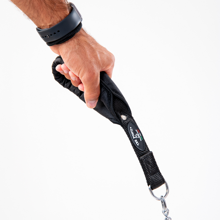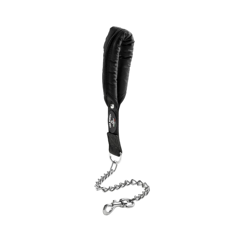 Leash with a padded grip, chrome-plated steel chain, and sturdy metal carabiner.